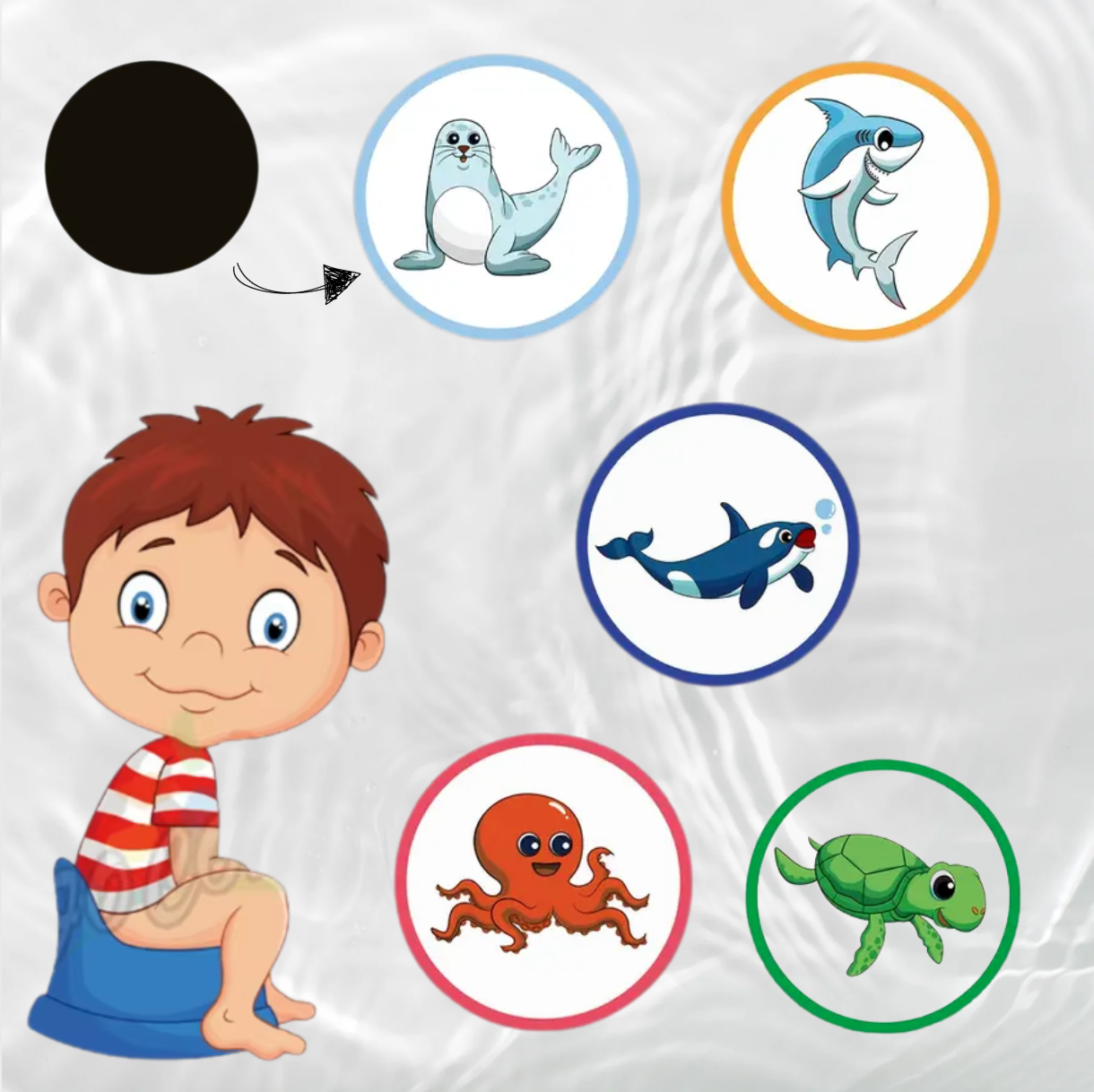 Każda naklejka przedstawia inne sympatyczne zwierzątko morskie, które pojawia się w nagrodę po udanym skorzystaniu z nocnika – foka, rekin, ośmiornica, żółwik i orka to mali pomocnicy w codziennym treningu czystości.