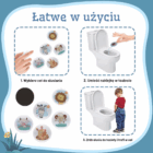 W standardowej toalecie z wodą naklejki mogą unosić się lub przesuwać, dlatego rekomendujemy ich użycie w nocniku lub w części toalety, gdzie nie są bezpośrednio wypłukiwane.